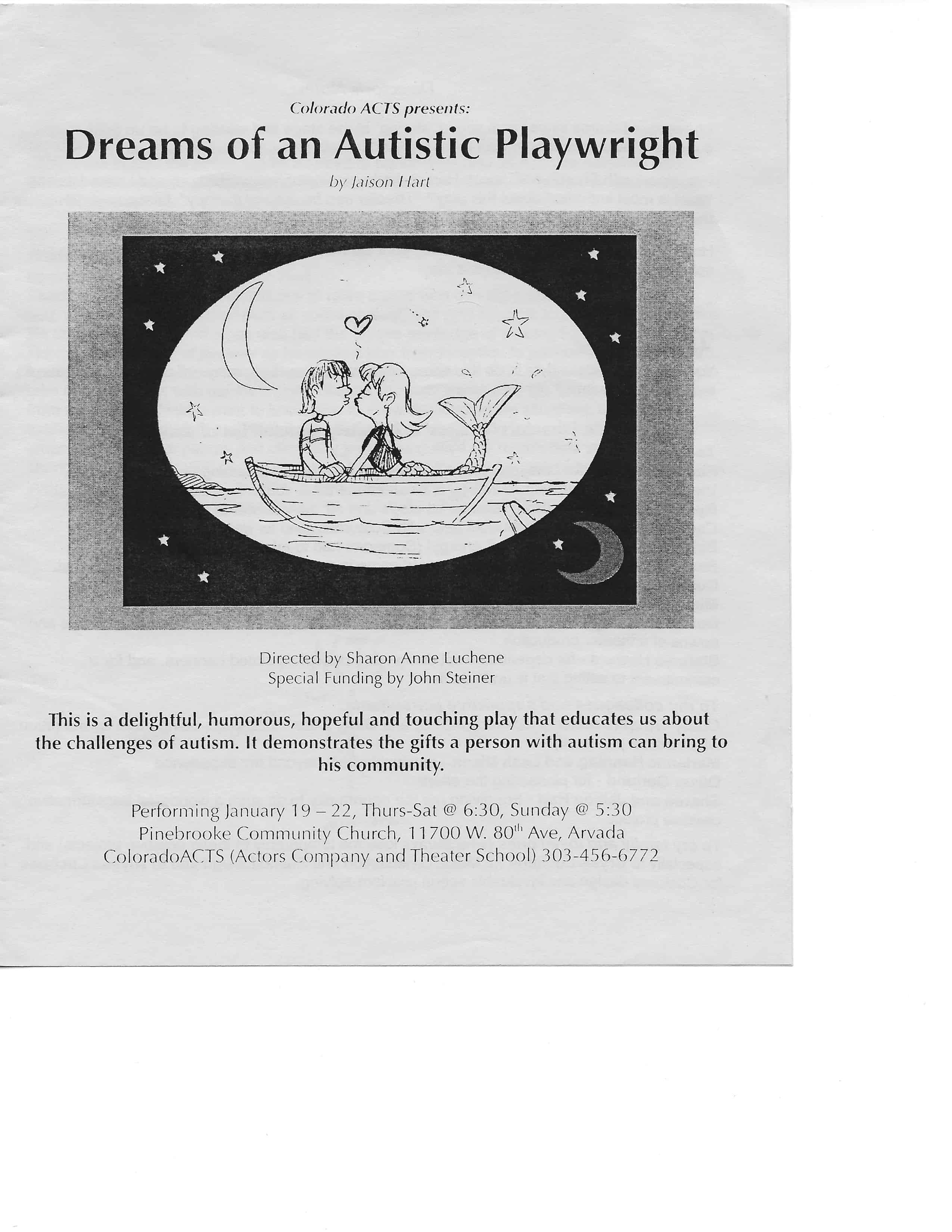 At fifteen, he began to write Dreams of An Autistic Playwright in hopes of sharing his message of love through his favorite medium- theater. His dream was to create a fun and uplifting play through which he could educate the public about autism. His deeper purpose was to bring TRUE friends into his life, and perhaps even find a girlfriend.